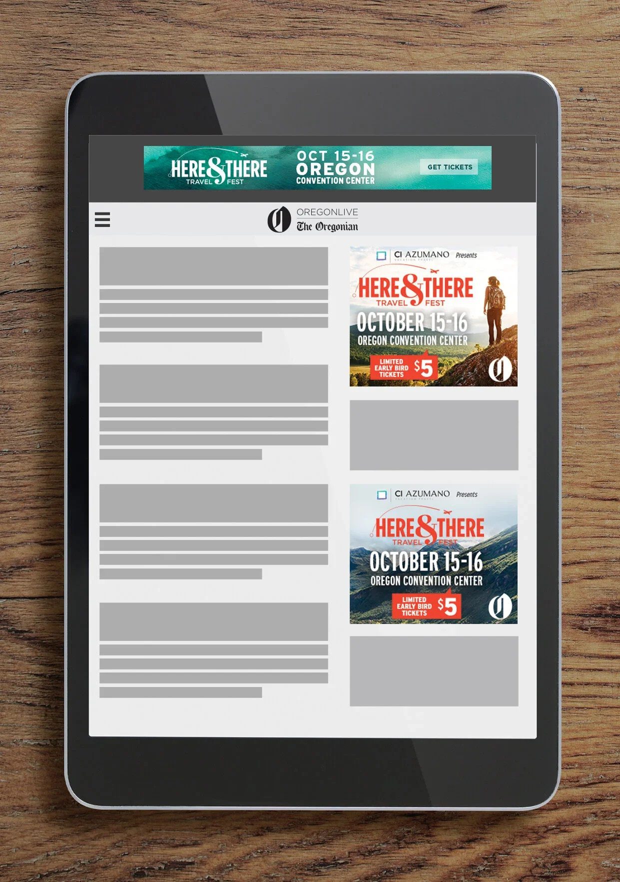 Developed the brand identity for The Oregonian’s Travel Fest, a tradeshow that is being established from the ground up. The Here & There Travel Fest had two main goals: to attract businesses to sponsor and purchase booths, and to draw in event attendees eager to plan their vacations.